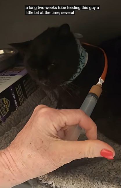 Today, he was purring & that made me cry. After 11 days of tube feeding this kitty 3 times a day while his eyes were closed, he just laid there with his head buried, I’m finally seeing some improvement.