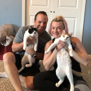 Oh I just couldn’t believe how sweet this young couple was that came to FURR! The husband (Steve) got there first with their little toddler and he saw REEBOK. He immediately said I have GOT to call my wife! That looks JUST like her beloved kitty that has passed………It wasn’t long before wife, Tracy, showed up. When Tracy took one look at REEBOK, she started crying! It was so emotional that we all were feeling for her! She took REEBOK in her arms and just sobbed! Then I got out NIKE and gave him to Steve and it was just one of those “meant to be” moments! The young couple definitely wanted REEBOK, but wasn’t sure about getting 2 kitties at this time with busy jobs and a toddler, but after Steve came over to FURR that evening, they could not resist!